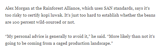 What worries me is that despite what the supplier says the coffee I bought does not publish the "wild and totally unfarmed/uncaged" claim on its website. Why not? Maybe ask National Geographic: https://t.co/ItO01xPY5w. https://t.co/xz968sF0rc pic.twitter.com/i2zPSONYCp